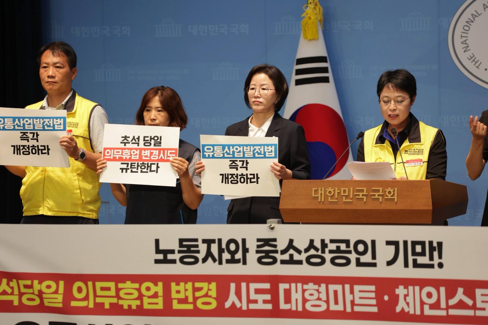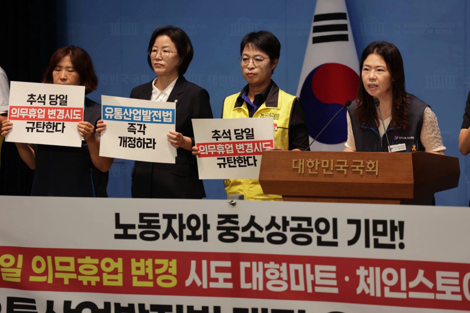 기자회견 참가자들은 이러한 행위가 꼼수라고 강력히 비판했습니다. 진보당 정혜경 국회의원은 “협회의 주장처럼 노동자의 명절 휴식권을 보장하기 위해서 기존 월2회 의무휴업일을 보장하면서 명절 당일에도 문을 닫아야 한다.”고 주장했습니다.