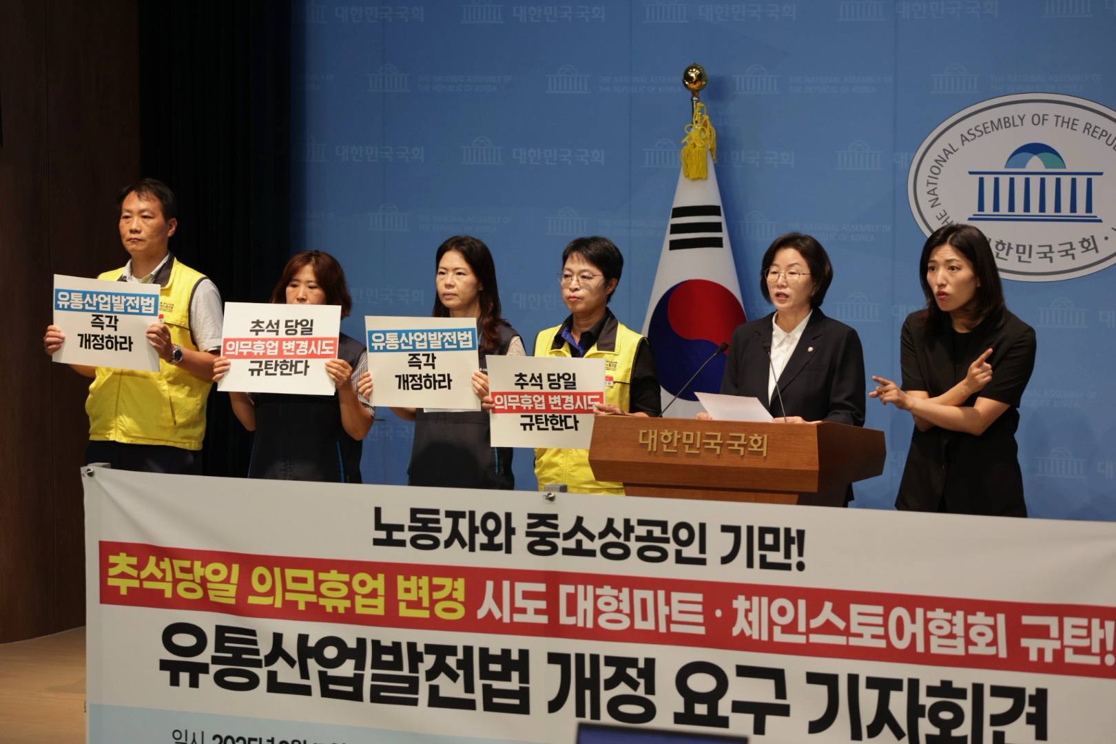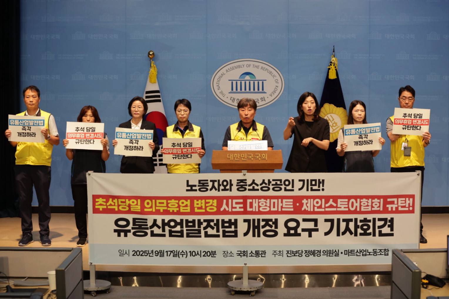진보당 정혜경 의원실과 마트산업노동조합(이하 마트노조)은 2025년 9월 17일(화) 10시 20분, 국회 소통관에서 기자회견을 열고 추석당일 의무휴업 변경을 시도하고 있는 체인스토어협회와 대형마트, 지자체를 규탄하고 노동자의 건강권과 소상공인의 생존권을 지키기 위한 유통법 개정을 촉구했습니다.