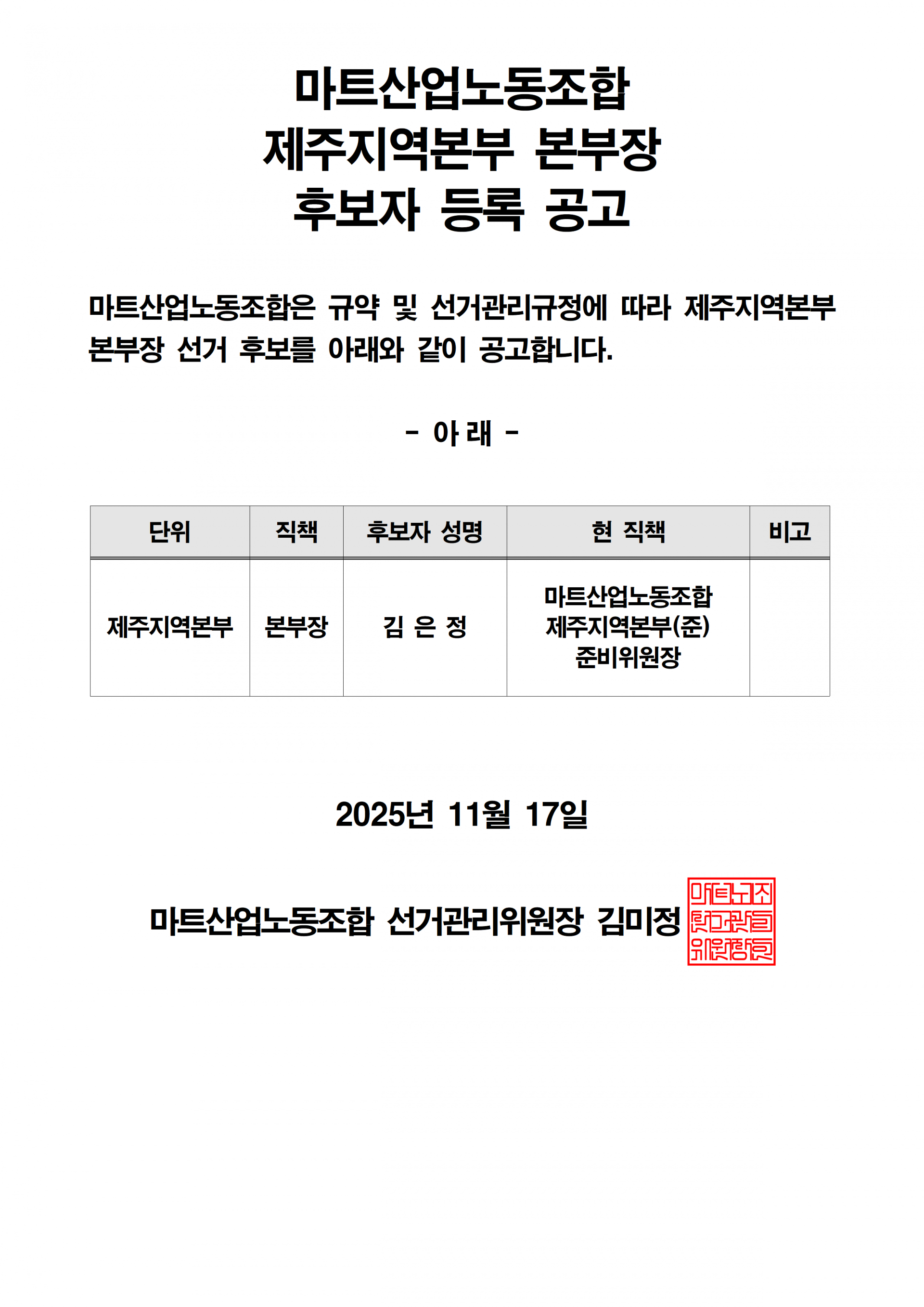 마트산업노동조합 제주지역본부 본부장 후보자 등록 공고