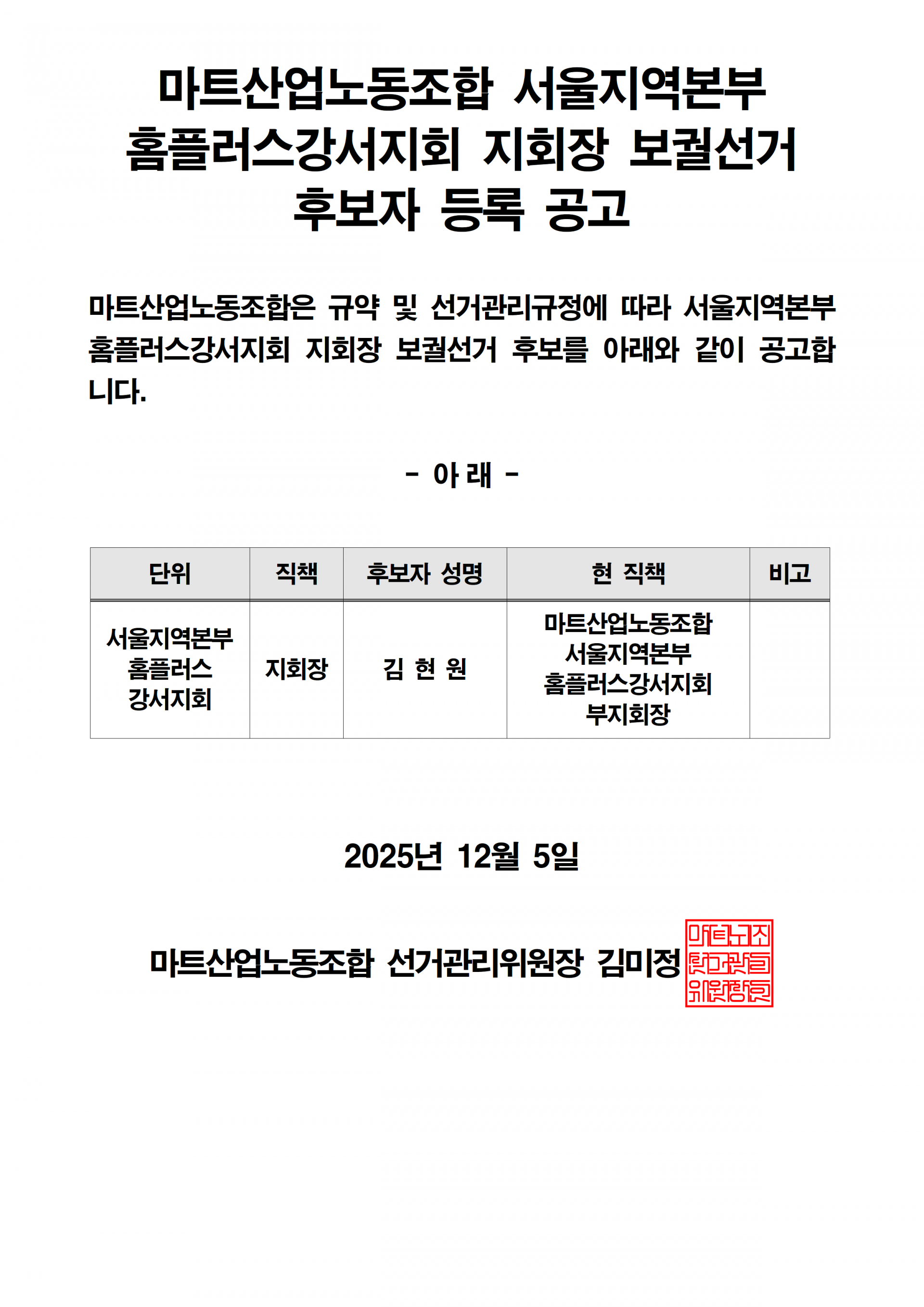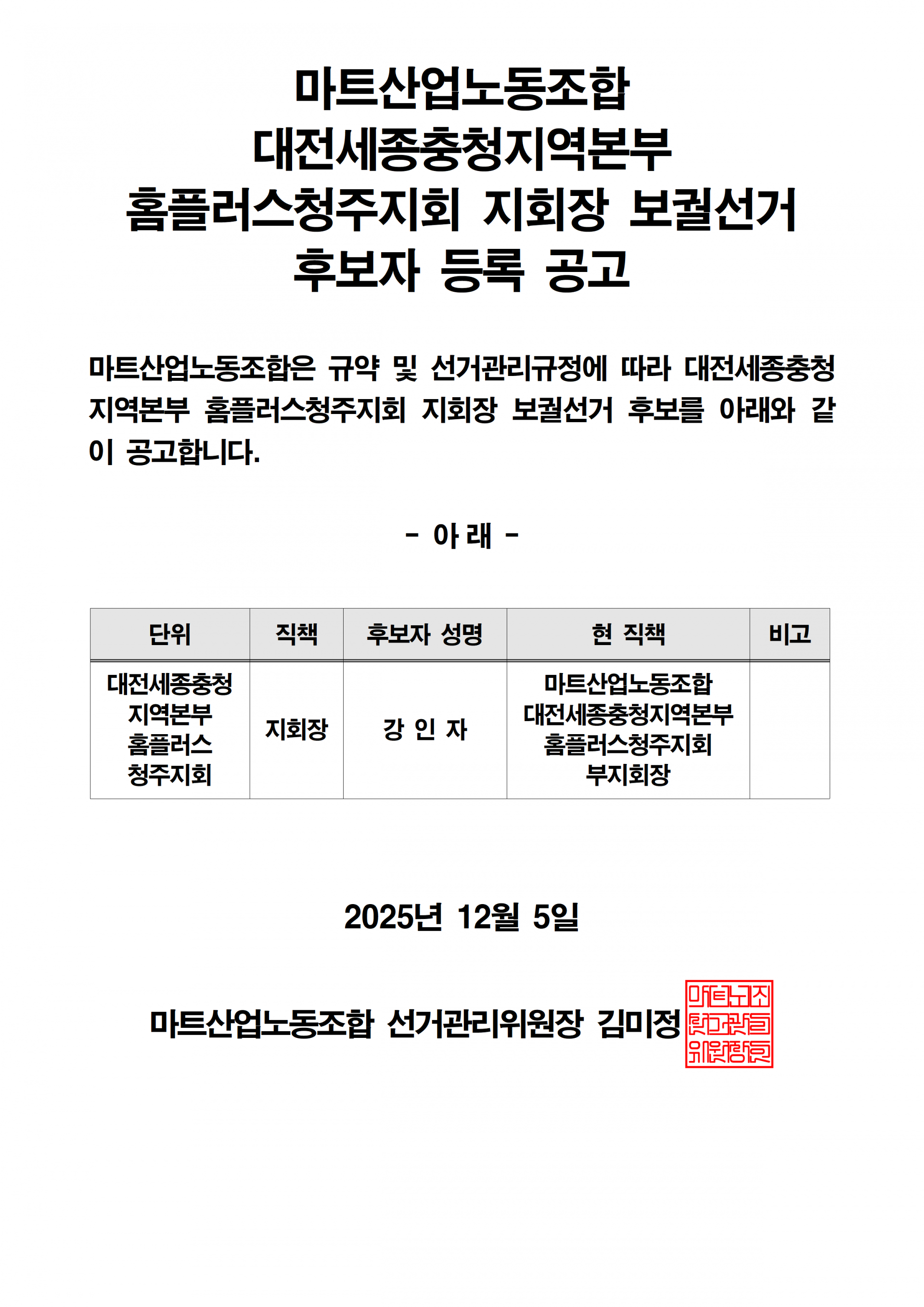 [공고] 마트산업노동조합 지회장 보궐선거 후보자 등록 공고 (홈플러스강서지회, 홈플러스청주지회)