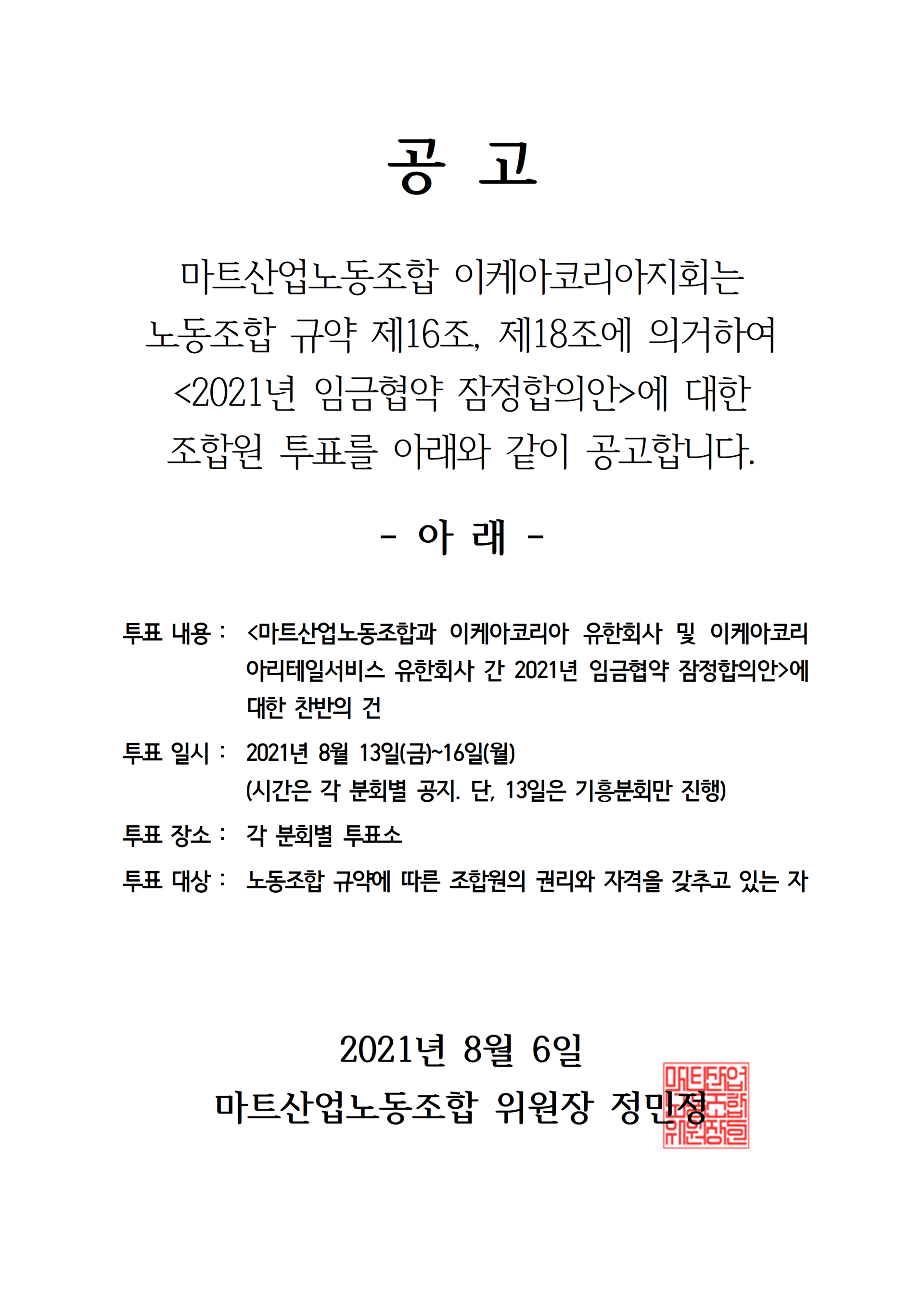 마트산업노동조합 이케아코리아지회는 노동조합 규약 제16조, 제18조에 의거하여 <2021년 임금협약 잠정합의안>에 대한 조합원 투표를 아래와 같이 공고합니다.