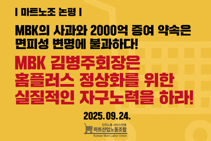 논평[논평] MBK의 사과와 2000억 증여 약속은 면피성 변명에 불과하다! MBK 김병주회장은 홈플러스 정상화를 위한 실질적인 자구노력을 하라!
