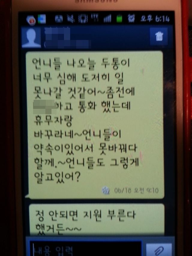 “언니들 나 오늘 두통이 너무 심해 도저히 일 못 나갈 것 같아. 관리자하고 통화 했는데 휴무자랑 바꾸라네”
