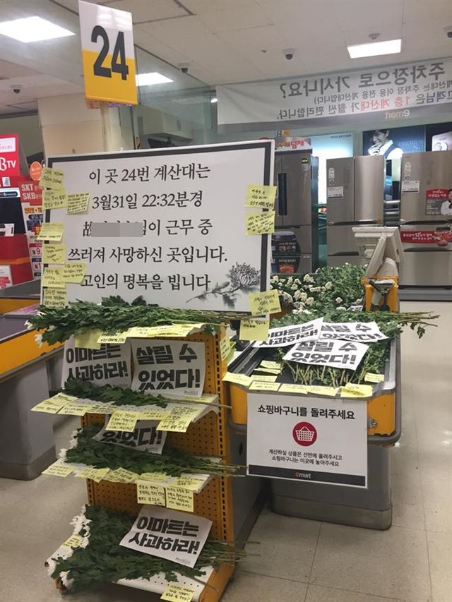 B씨가 쓰러진 구로 이마트 24번 계산대 위에 국화가 놓여 있다.
