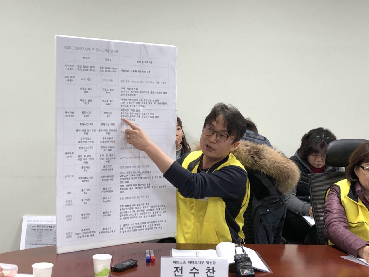 전수찬 위원장은 "정산소에서 계산대까지 이동하는 시간만 5분에서 10분이 걸린다"면서 "준비-마감을 10분 안에 하라고 하는 것은 현실적으로 불가능한 요구"라고 말했다. 또 "정상적인 업무를 하기 위해 현장 노동자들은 조기출근을 하는 등 사실상 임금꺾기 현상이 나타나고 있다"면서 "일부 매장에서는 관리자들이 30분 동안 밥을 먹고 30분은 일을 하라고 한다"고 말했다. 차순자 마트노조 이마트지부 수원지회장도 "즉석조리식품 코너에서 일하는 동료는 8시간 근무할 때도 김밥 100개를 말았지만, 7시간 근무를 할 때도 100개를 말아야 한다"며 "물리적으로 불가능한 노동강도지만, 근로시간을 맞추기 위해 화장실 가는 시간마저 아끼려고 물을 안 마시고 있는데, 이게 업무효율을 높이는 방법인지 잘 모르겠다"고 말했다.