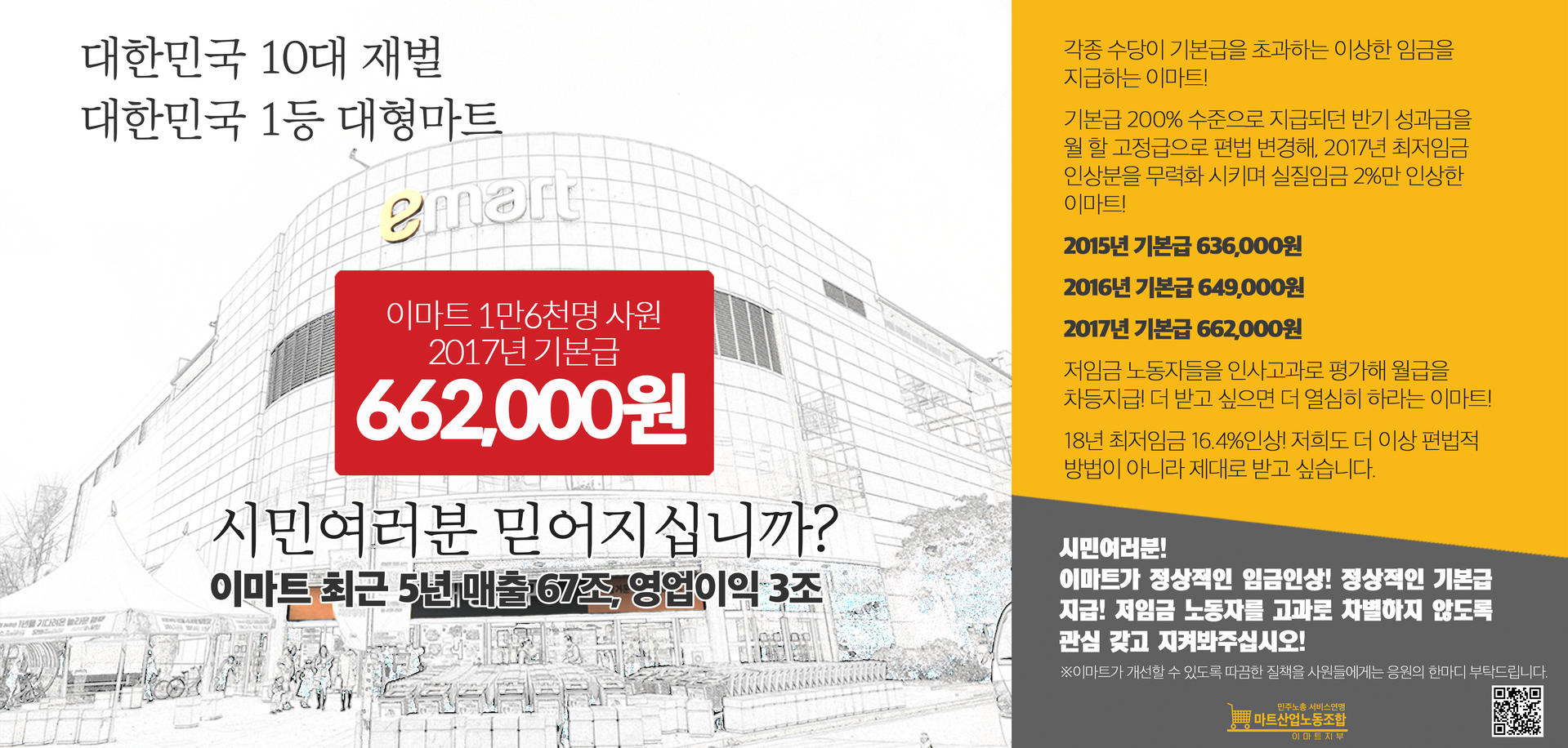 마트노조 이마트지부에서는 오늘부터 이마트의 기본급을 폭로하는 투쟁을 시작했습니다.